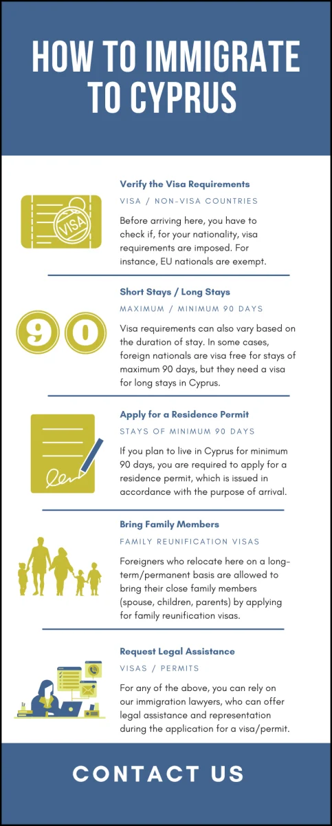 Persons interested in receiving immigration services in this country are invited to contact our immigration lawyer in Cyprus. Our team can assist with additional services, other than the ones presented in this article. Please contact our lawyers for professional assistance and tailored advice concerning the most suitable way you can immigrate to Cyprus.