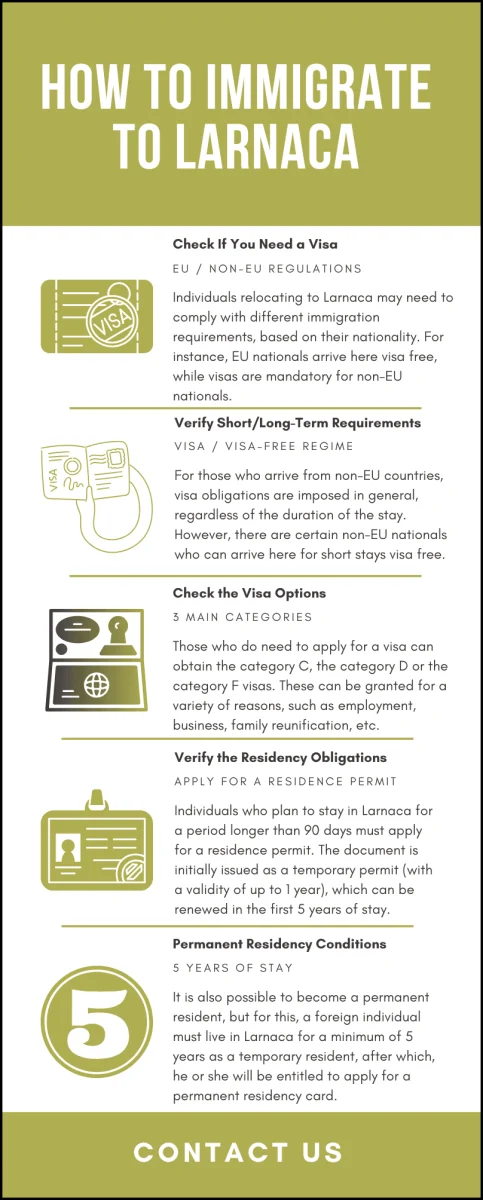 One also needs to have a clean criminal record that must be added to the citizenship file, along with other supporting documents required by the local authorities. In the list below, you can read our infographic on how to immigrate to Larnaca: