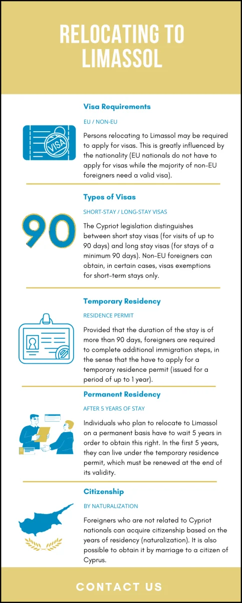 Persons relocating to Limassol will generally have to apply for a visa when arriving here (unless exempt). Depending on the visa type and more exactly, depending on its validity, the applicant should also initiate the steps for obtaining aresidence permit in Cyprus. The permit is necessary when a foreigner arrives in this country for more than 90 days.