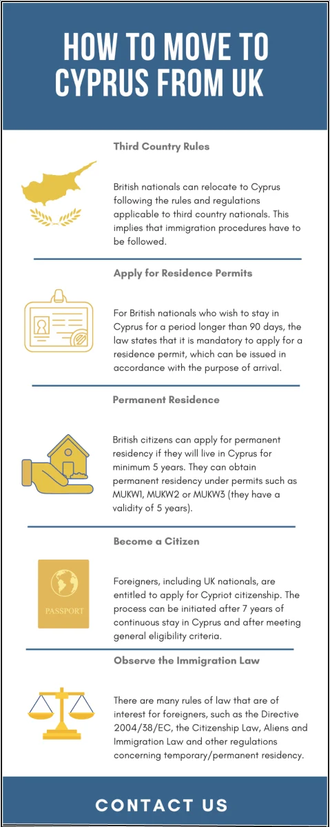 British persons can apply for the MUKW1 document, which is a residence permit that grants the right to reside in Cyprus for a period of 5 years and which is issued to British nationals and their close family members who are also British nationals; another option is to apply for the MUKW2 document, a residence permit that must be obtained by the family members of the UK nationals, as long as the said family members are non-UK nationals.