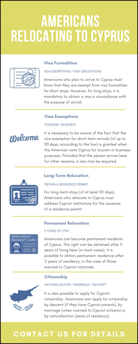 | Visas for long-term immigration from US to Cyprus | Visas are necessary, and they can be issued for work, business, study, etc. |